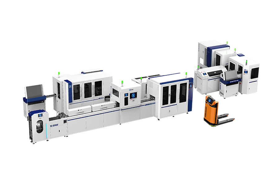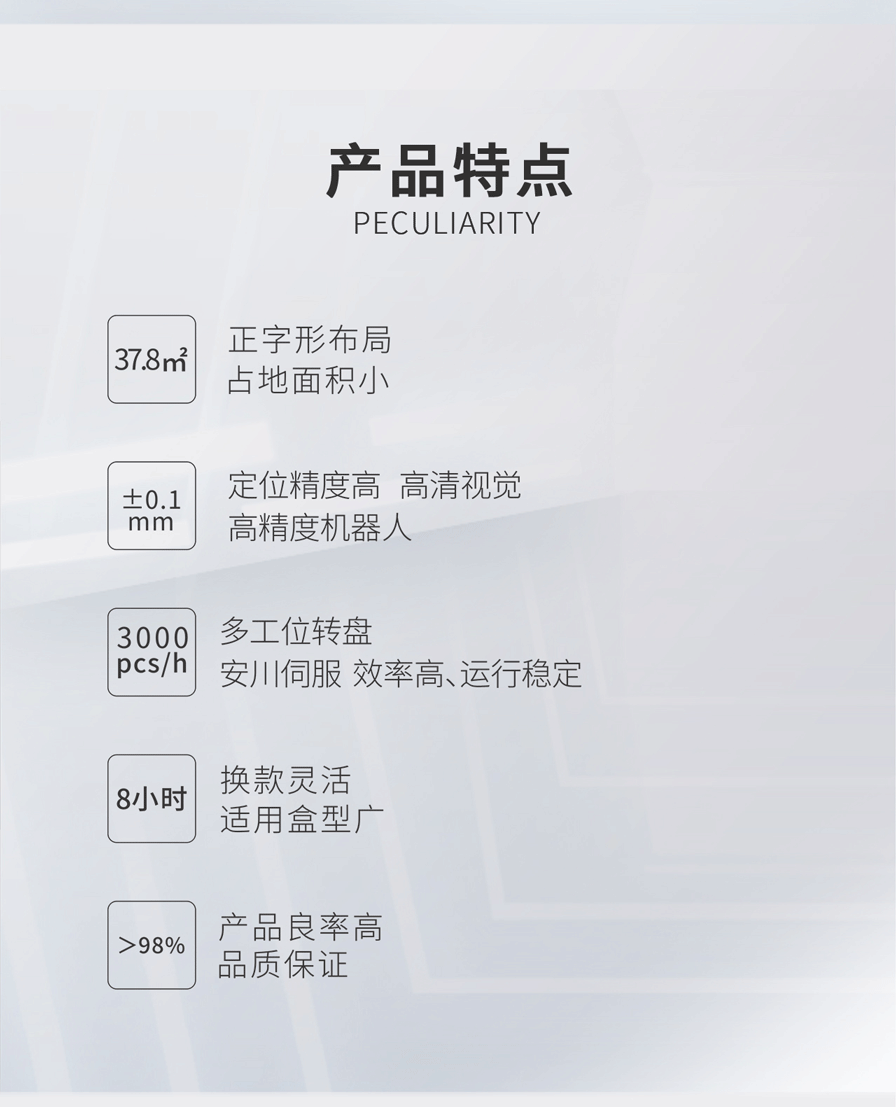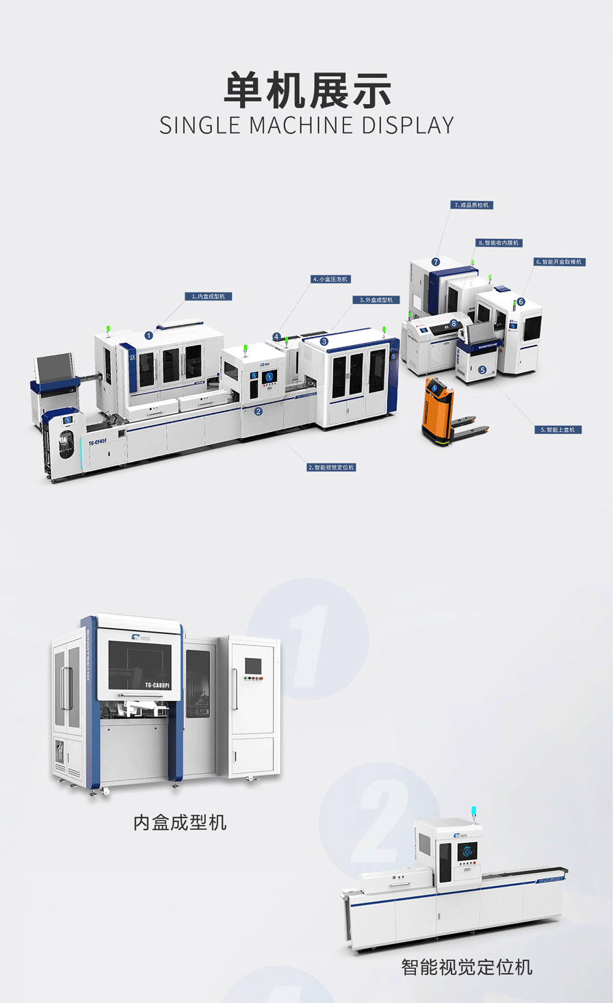 中科天工智能煙包臻品小盒數(shù)字化整線是我司針對(duì)高端精品煙包小盒和電子煙領(lǐng)域,完全自主研發(fā)的柔性化制盒專(zhuān)用整線。 該整線可實(shí)現(xiàn)自動(dòng)上內(nèi)模、圍條、上/下蓋、面紙的供送、圍合、合攏、印膠、校正、預(yù)成型、保壓、打角、絲 印上膠、視覺(jué)定位、成型、正壓、四面壓泡、出盒、開(kāi)盒取模、投干燥劑、收內(nèi)模、在線六面檢等生產(chǎn)流程 全自動(dòng)化。線體采用分體式機(jī)組、占地面積小、可拓展性強(qiáng)、生產(chǎn)效率高、運(yùn)行平穩(wěn)、定位精度高、盒型 尺寸適應(yīng)范圍廣,柔性可調(diào)。我司針對(duì)此線,已申請(qǐng)多項(xiàng)專(zhuān)利,擁有完整的專(zhuān)利保護(hù)鏈。