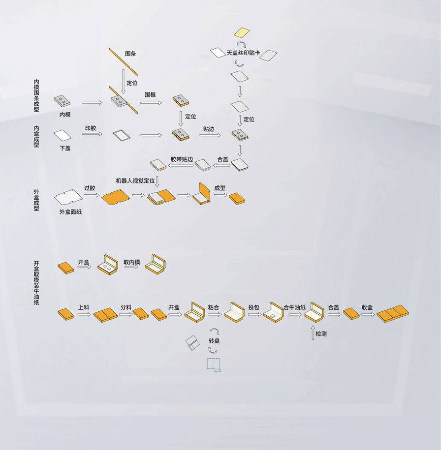 中科天工智能復(fù)合型煙包條盒數(shù)字化整線工藝完整、自動化程度高,在行業(yè)內(nèi)屬于高效益產(chǎn)線,適用于復(fù)合類產(chǎn)品全自動化生產(chǎn)。 該整線完整的解決了微商條盒為代表的異形天地蓋成型皮殼成型、圍框成型、圍框組裝、內(nèi)盒組裝、 貼絲帶、貼牛油紙、貼連接紙、皮殼與內(nèi)盒組裝等全套工序;采用模塊化設(shè)計,分段式控制,數(shù)字化調(diào)節(jié), 操作簡單,人力極大精實。中科天工針對復(fù)合型煙包條盒類產(chǎn)品專項開發(fā)的多功能智能產(chǎn)線,有獨立的 知識產(chǎn)權(quán)和一站式解決方案。