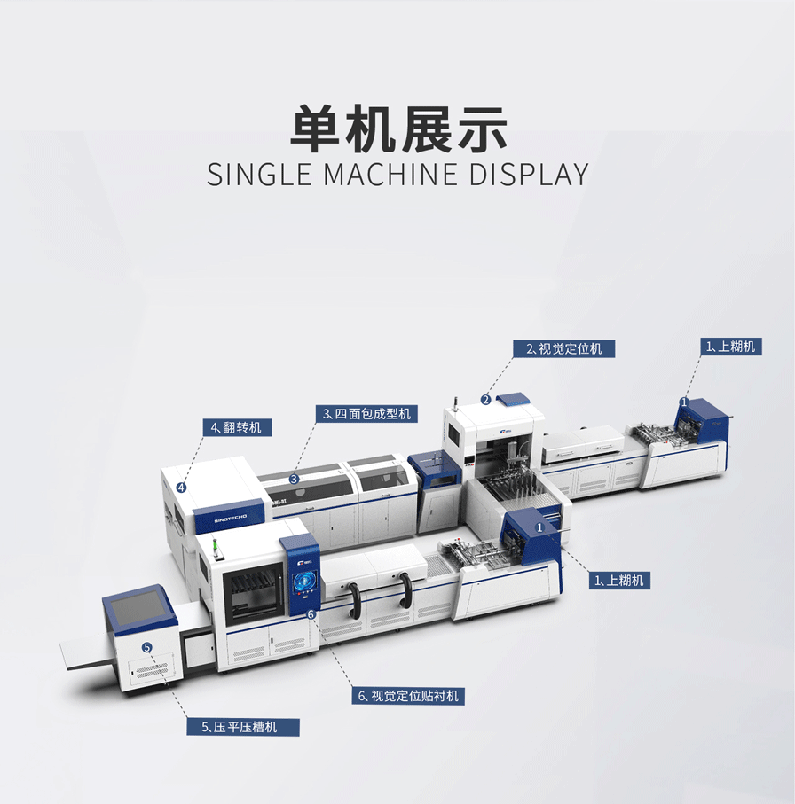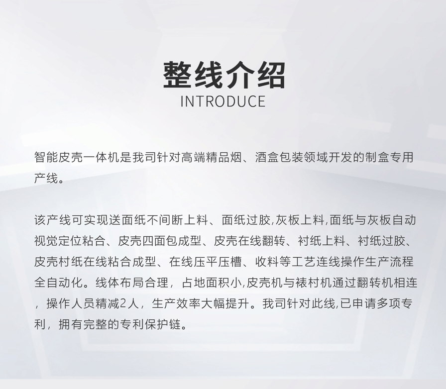 智能皮殼一體機(jī)是我司針對(duì)高端精品煙、酒盒包裝領(lǐng)域開(kāi)發(fā)的制盒專(zhuān)用產(chǎn)線(xiàn)。