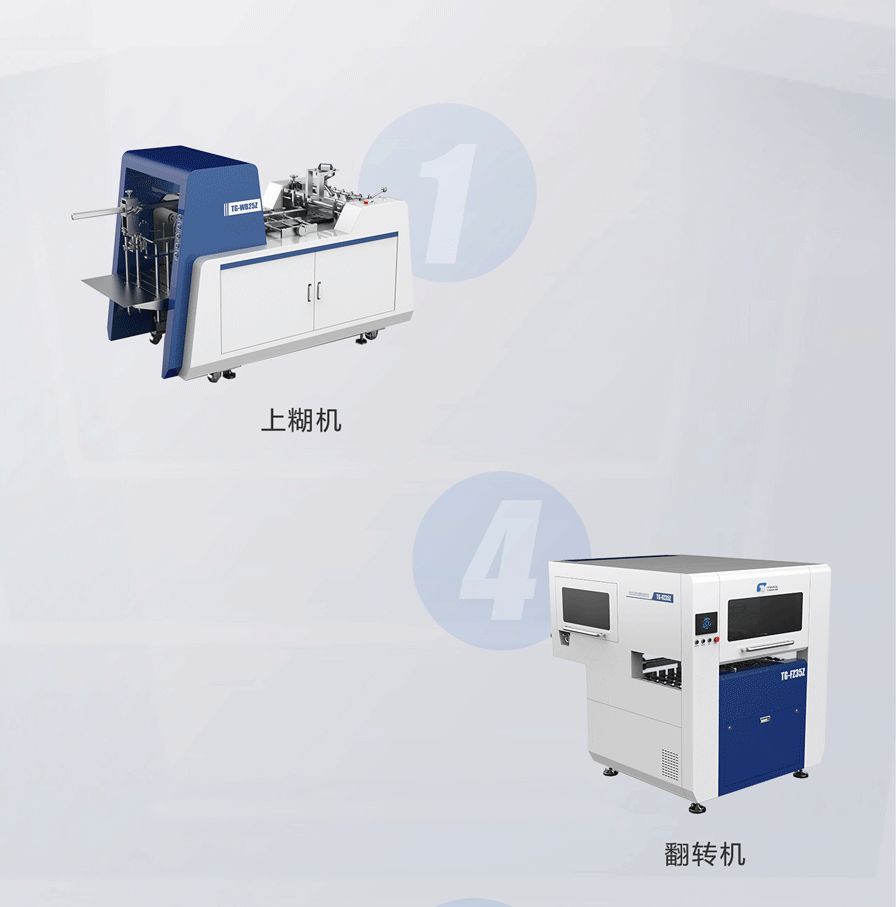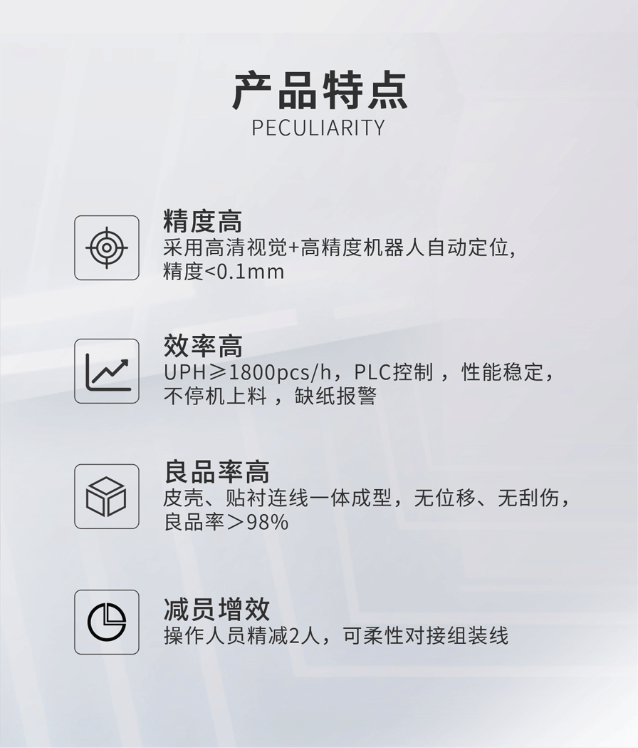該產(chǎn)線(xiàn)可實(shí)現(xiàn)送面紙不間斷上料、面紙過(guò)膠,灰板上料,面紙與灰板自動(dòng)視覺(jué)定位粘合、皮殼四面包成型、皮殼在線(xiàn)翻轉(zhuǎn)、襯紙上料、襯紙過(guò)膠、皮殼襯紙?jiān)诰€(xiàn)粘合成型、在線(xiàn)壓平壓槽、收料等工藝連線(xiàn)操作,生產(chǎn)流程全自動(dòng)化。線(xiàn)體布局合理,占地面積小,皮殼機(jī)與裱襯機(jī)通過(guò)翻轉(zhuǎn)機(jī)相連,操作人員精減2人,生產(chǎn)效率大幅提升。我司針對(duì)此線(xiàn),已申請(qǐng)多項(xiàng)專(zhuān)利,擁有完整的專(zhuān)利保護(hù)鏈。