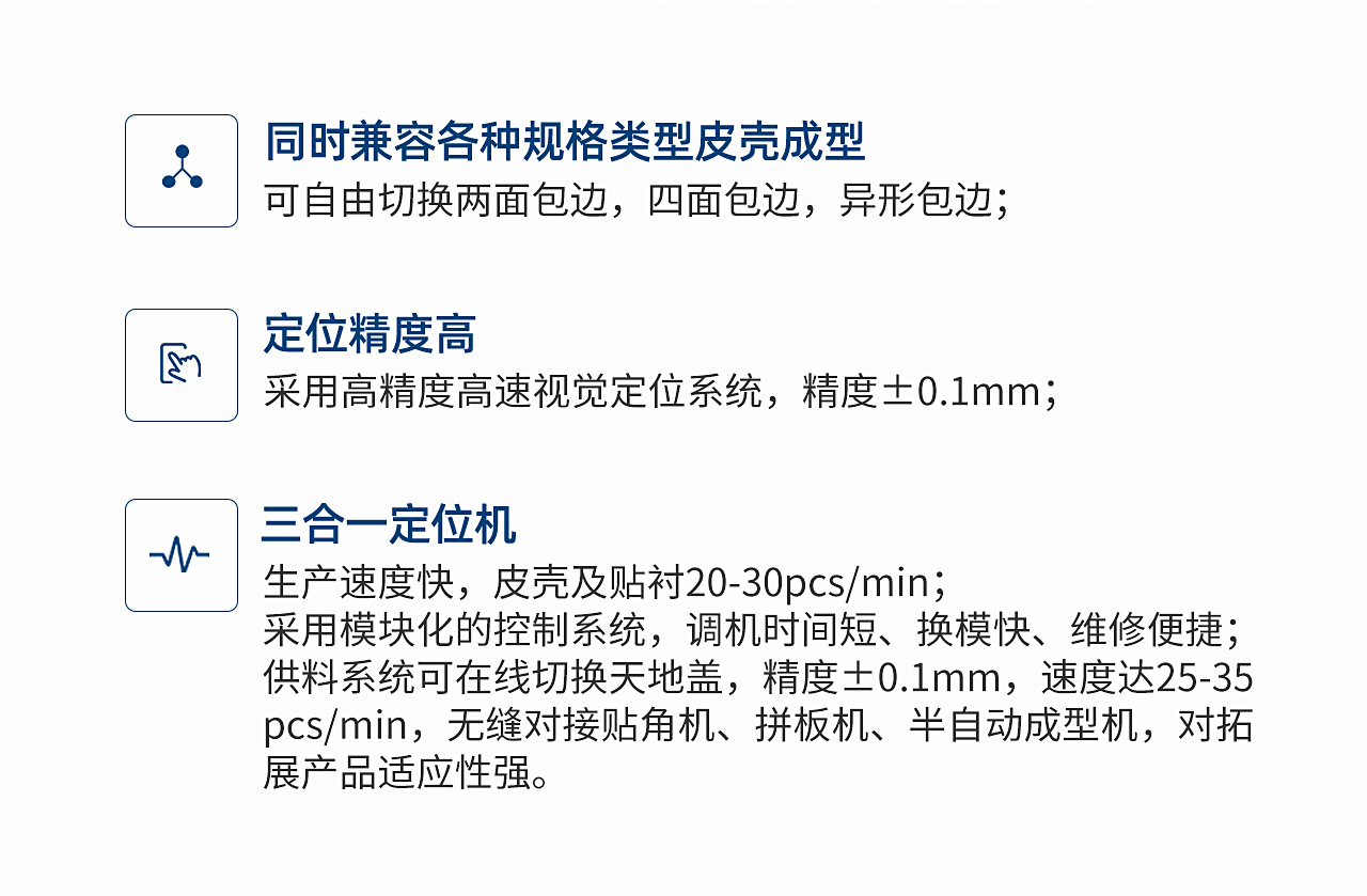 TG-PF20C型全智能皮殼成型機是我司研發(fā)的通用多功能皮殼成型設備,能適應單片、多片、異型和圍條的成型。同時兼容各種規(guī)格類型皮殼成型,可自由切換;獨立工位掐角成型質量好。