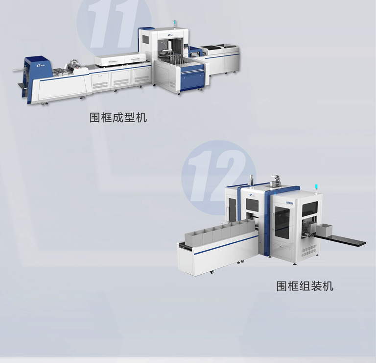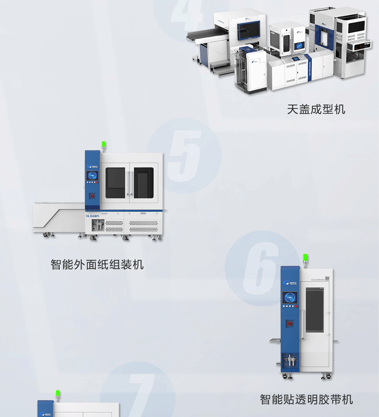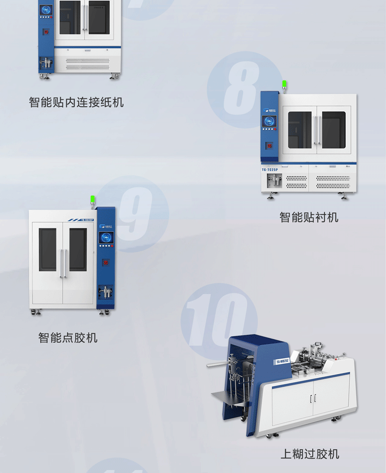 該數(shù)字化產(chǎn)線完整的解決了灰板成型、天地蓋成型、圍框成型、天地蓋組裝、自動貼襯、自動貼連接紙、自動噴膠組裝等全套工藝;采用模塊化設計,分段式控制,數(shù)字化調(diào)節(jié),操作簡單,人力極大精實。是我司針對箱式酒盒類產(chǎn)品專項開發(fā)的多功能智能產(chǎn)線,擁有獨立的知識產(chǎn)權(quán)和完整的一站式實施解決方案。