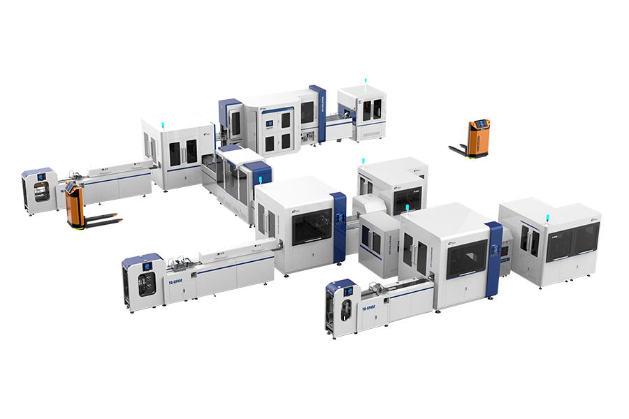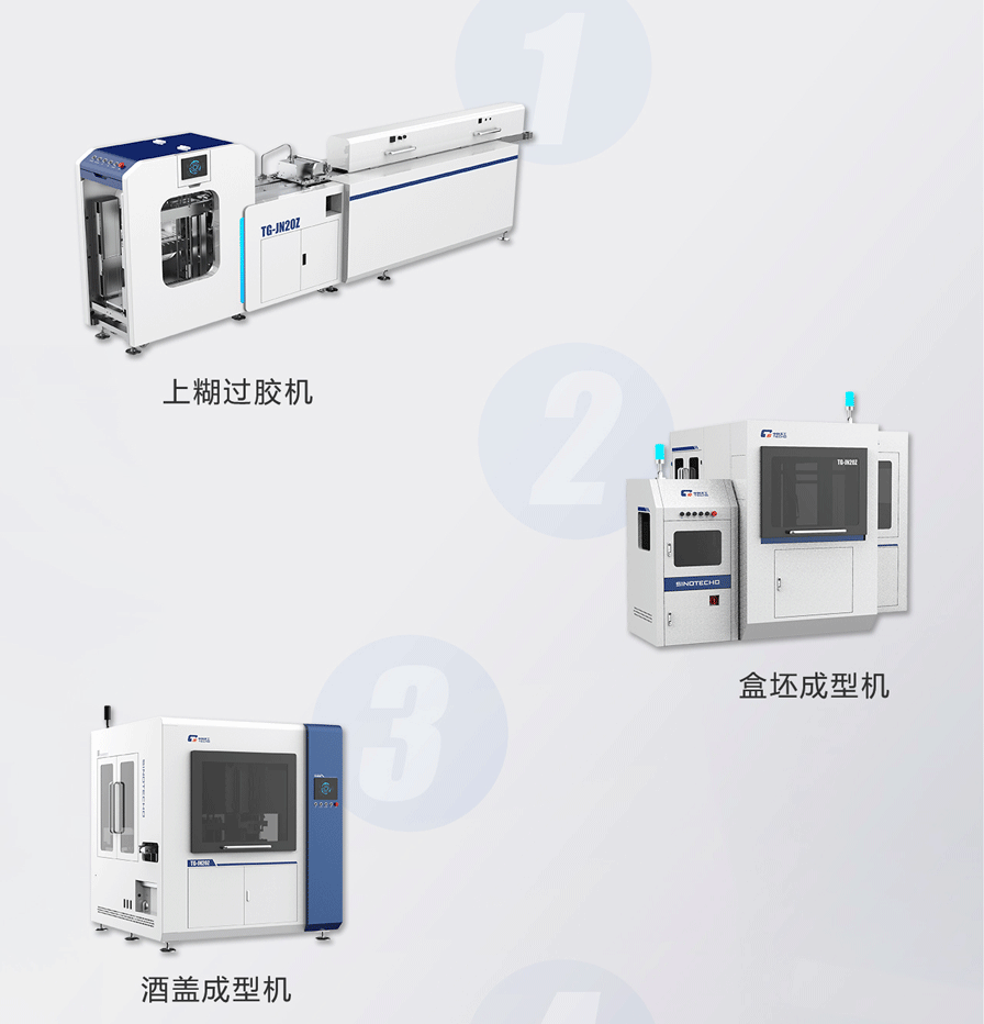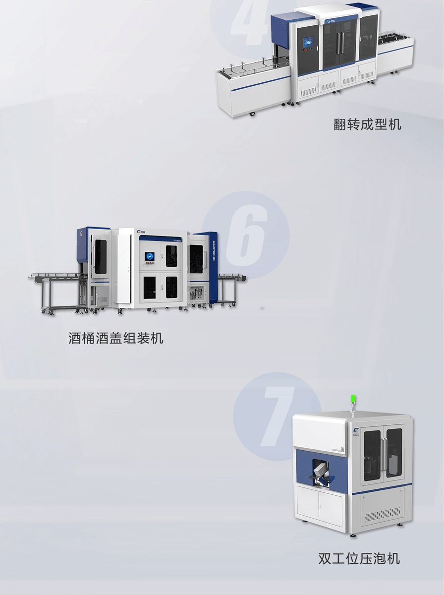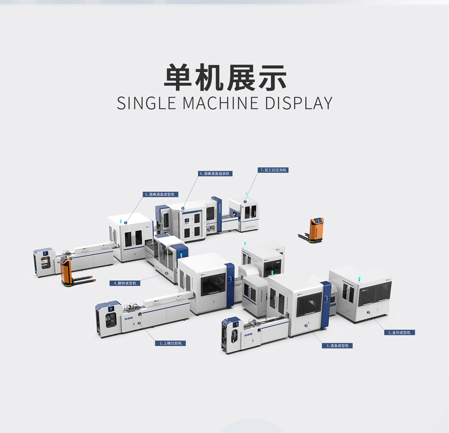 該整線完整的解決了盒坯成型、自動(dòng)過膠定位、自動(dòng)包面成型、自動(dòng)組裝成型、自動(dòng)貼襯、自動(dòng)貼連接 紙、自動(dòng)壓泡等全套工藝;采用模塊化設(shè)計(jì),總線式控制,數(shù)字化調(diào)節(jié),操作簡單,人力極大精實(shí)。是我 司針對異型酒盒類產(chǎn)品專項(xiàng)開發(fā)的復(fù)合功能智能整線,擁有獨(dú)立的知識產(chǎn)權(quán)和一站式解決方案。