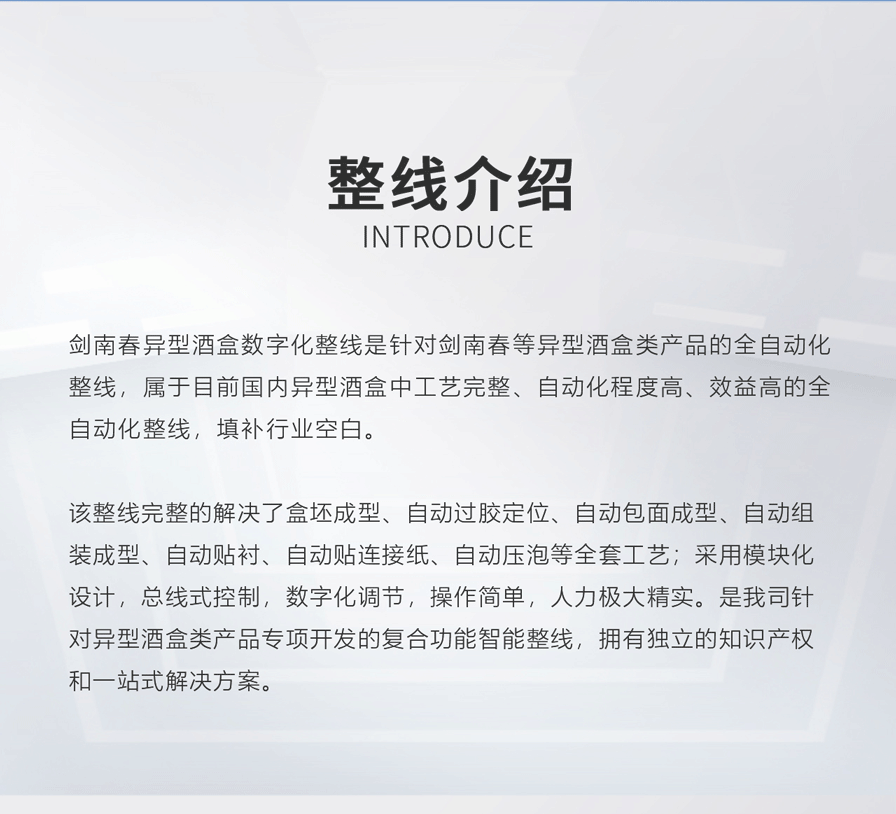 劍南春異型酒盒數(shù)字化整線是針對劍南春等異型酒盒類產(chǎn)品的全自動(dòng)化整線,屬于目前國內(nèi)異型酒 盒中工藝完整、自動(dòng)化程度高、效益高的全自動(dòng)化整線,填補(bǔ)行業(yè)空白。